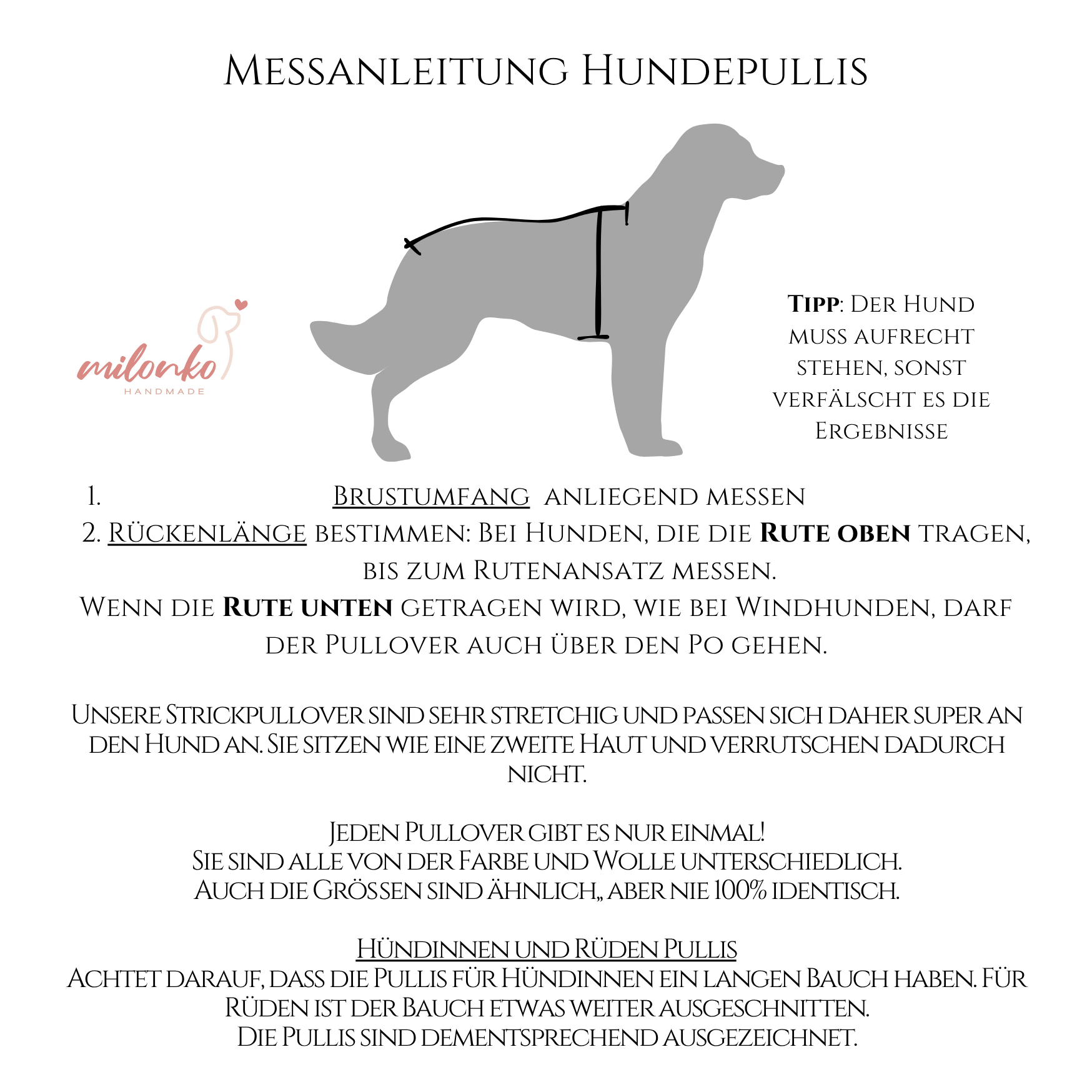 Tipp: Unsere Erfahrung hat gezeigt, dass die Pullover besser passen, wenn der Rücken 1-3cm länger ist als ausgemessen. Durch die Bewegung der Hunde bleiben so die Nieren schön warm. Der Brustumfang solle ca. in der Mitte liegen, vom angegebenen Bereich. Jeder Pullover wird in liebevoller Handarbeit von Hand gestrickt. Keine Nähte, keine Verschlüsse. Dadurch wird die höchste Bequemlichkeit für unsere Hunde garantiert. Sie sitzen enganliegend, wie eine zweite Haut. Es können auch Mäntel darüber angezogen werden, sofern der Mantel groß genug ist.